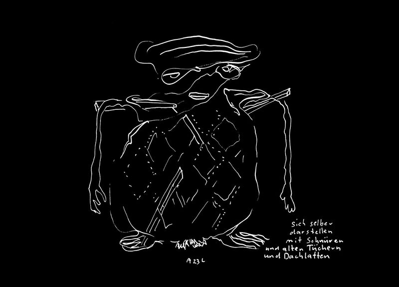 sich selber darstellen mit Schnüren und alten Tüchern und Dachlatten